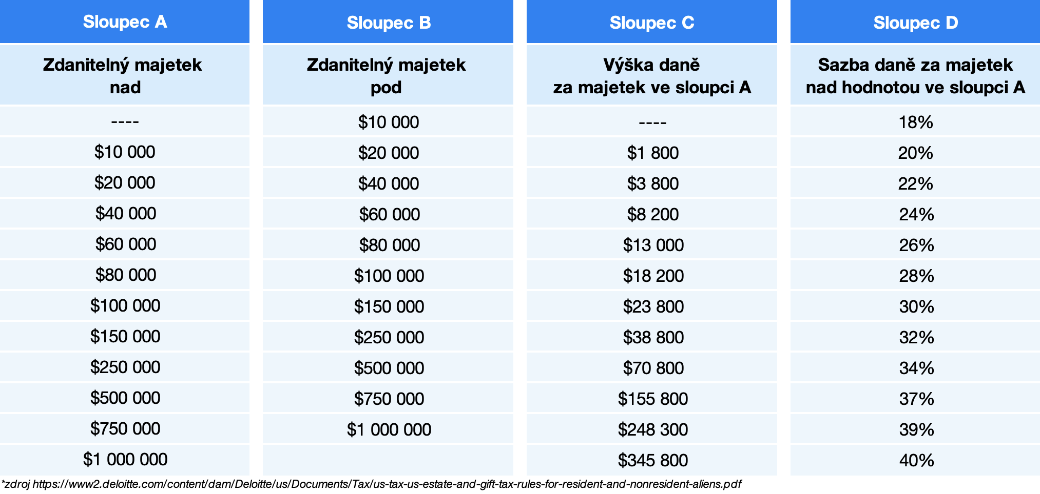 Daň z dědictví (Estate tax) se vztahuje na majetek každého, kdo v době smrti vlastní nějaká americká aktiva, ať už nemovitost na Floridě nebo akcie Apple. Pro občany USA je hranice, od které musí platit daň, až při několika milionech, pro takzvané non-resident aliens je již při 60tisících dolarech.