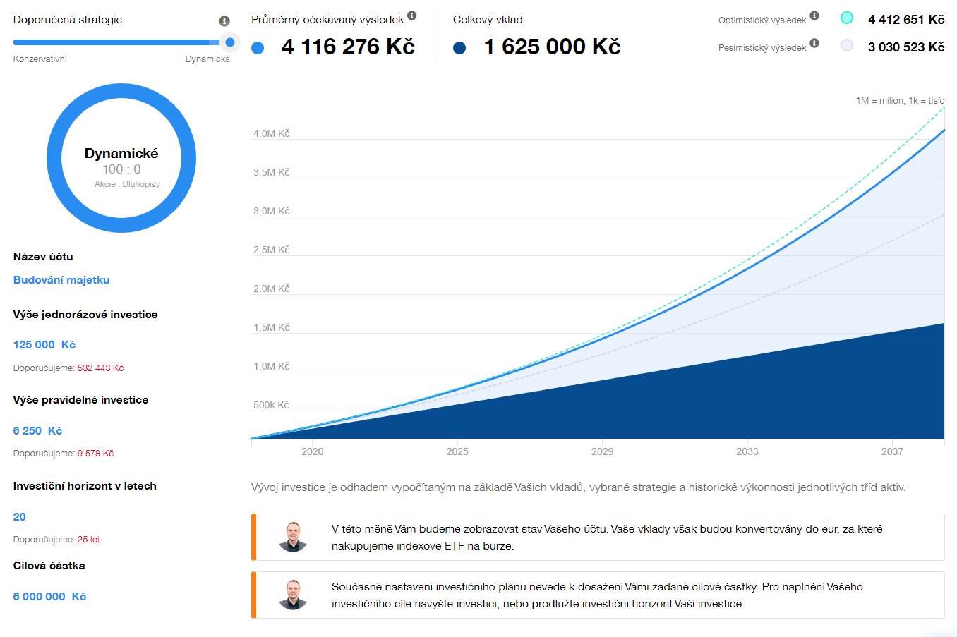 Pokud byste si do našeho plánovače zadali cílovou částku 6 milionů korun a chcete si ji našetřit do 15 let, tak přesně uvidíte, kolik si potřebujete posílat pravidelně, resp. jednorázově, abyste se k této částce dopracovali.