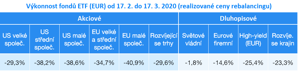 Za normálních okolností rebalancing provádíme během investičních dní, kdy realizujeme základní nákupy a prodeje ETF v portfoliích. Vzhledem k tomu, že šlo o první masivní rebalancing týkající se velkého počtu investičních účtů, tedy o první pořádnou zkoušku ohněm, jeho realizaci jsme pro jistotu vyčlenili na samostatný den. Proběhl následující den po investičním dni, tj. ve středu 17. 3. 2020.