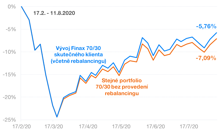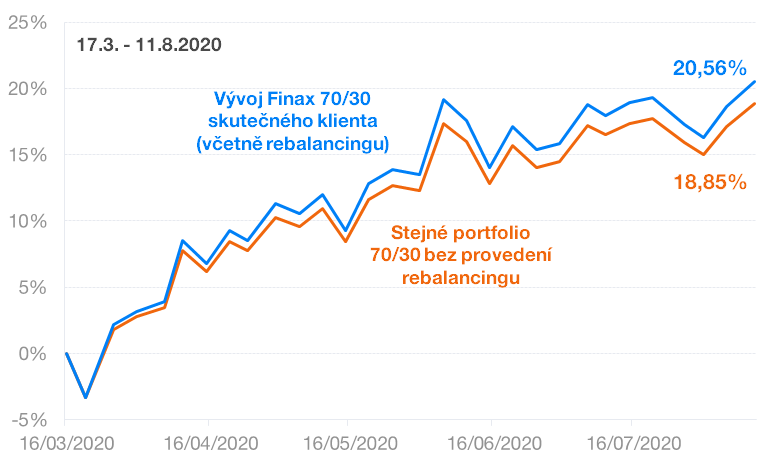 Vývoj těchto dvou portfolií ukazuje následující graf. Modrá křivka reprezentuje skutečný vývoj portfolia klienta Finaxu a oranžová stejné portfolio bez provedení rebalancingu 17. 3. 2020.