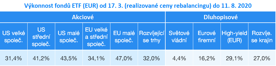 Další tabulka odhaluje eurové výnosy jednotlivých fondů ETF tvořící portfolia Finax od provedení rebalancingu 17. 3. (realizované ceny) do 11. 8. 2020 (zavírací ceny).