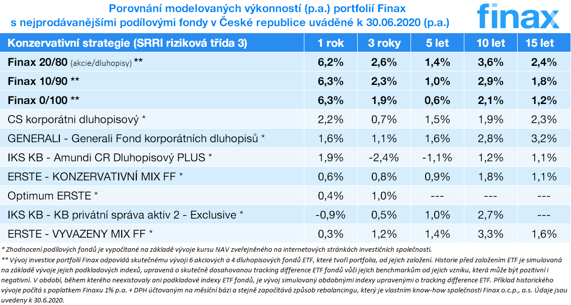 Paradoxně konzervativní konkurence zaměřená právě na profitující dluhopisy nedokázala situace využít ve svůj prospěch a výkonnostně výrazně zaostává za pasivními řešeními, které Finax nabízí. Kterékoliv konzervativní portfolio Finaxu dosáhlo víc jak 2,5násobně vyššího zhodnocení oproti konkurenci.