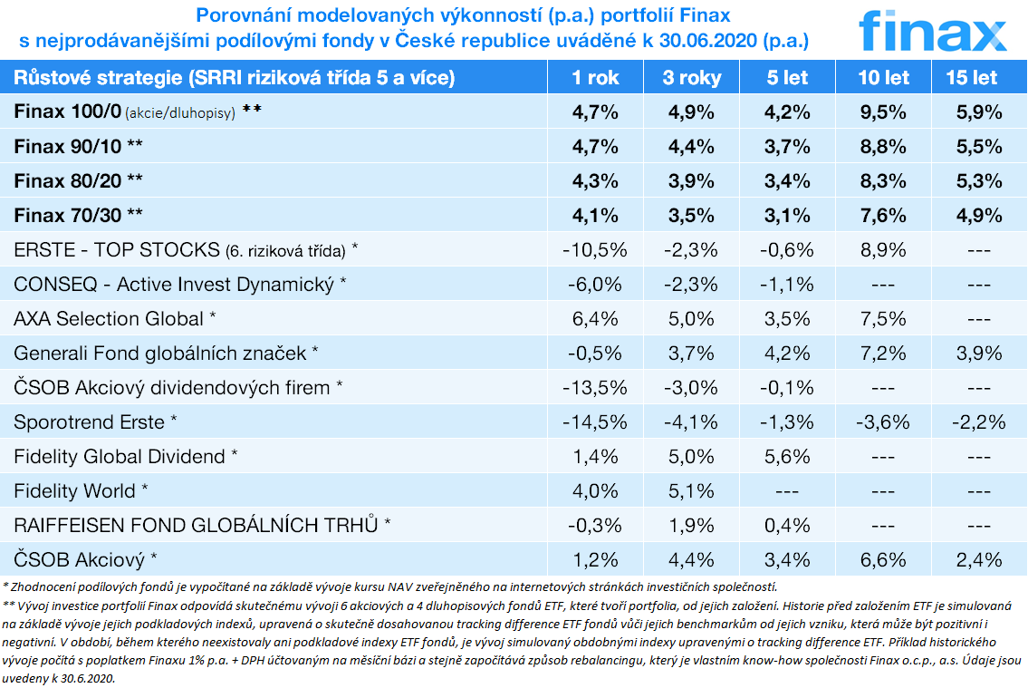 Bohužel data k horizontu deseti let nejsou u více fondů dostupné, a to z důvodu nedostatečné historie zmíněných fondů. Zbývající podílové fondy, kde je tato historie dostupná, jsou hladce porážena Finax portfolii.