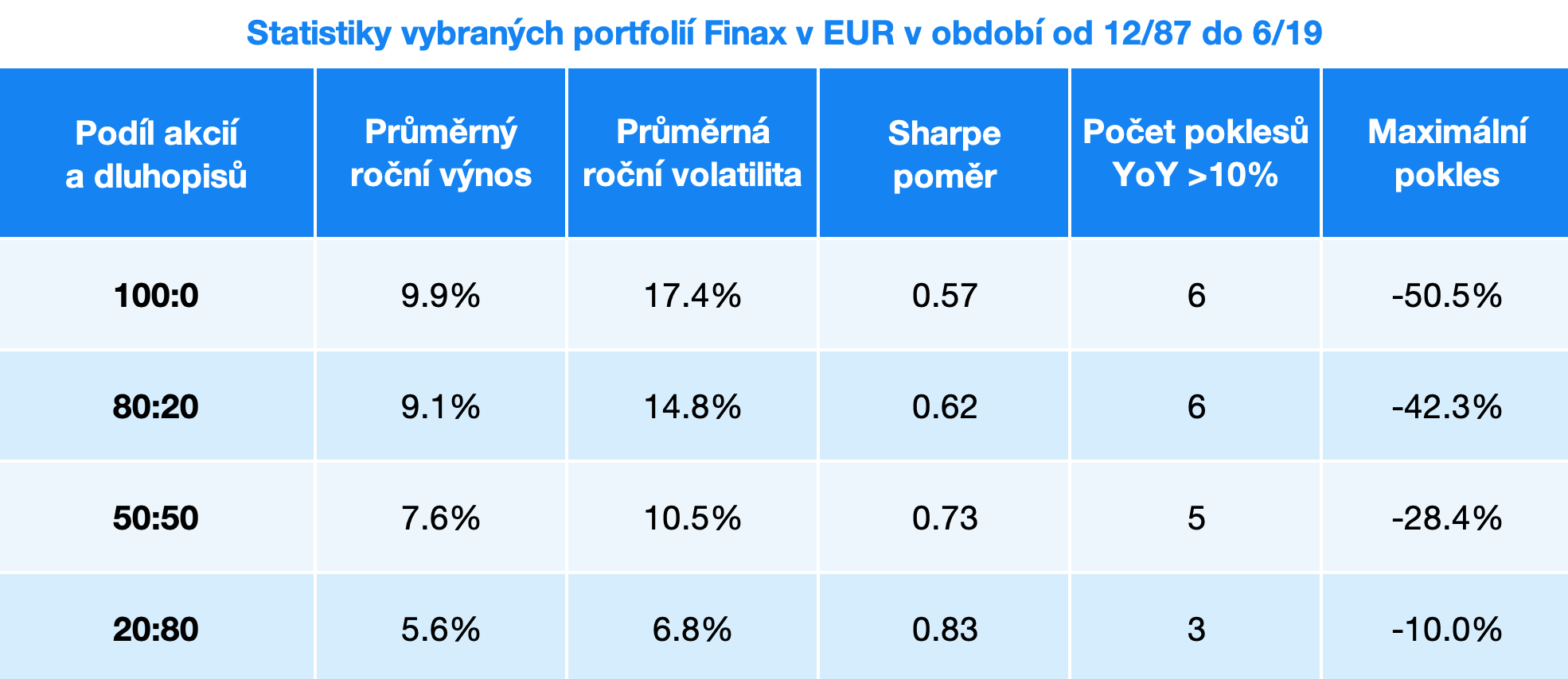 Následující tabulka nejlépe dokladuje smysl dluhopisů v portfoliu. Ukazuje průměrný roční výnos, roční volatilitu (rozptyl ročních zhodnocení), počet poklesů větších než 10% a maximální pokles vzorových portfolií Finaxu s různým zastoupením akciových a dluhopisových fondů, tedy s různým rizikem, a to během uplynulých 31,5 let.