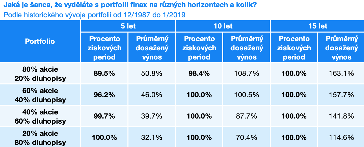 Tento vztah nejlépe ilustruje další tabulka, která je většině inteligentních investorů dobře známa. Ukazuje pravděpodobnost ziskovosti čtyř vybraných portfolií Finaxu s různou alokací, a tedy i rizikem na různých horizontech.