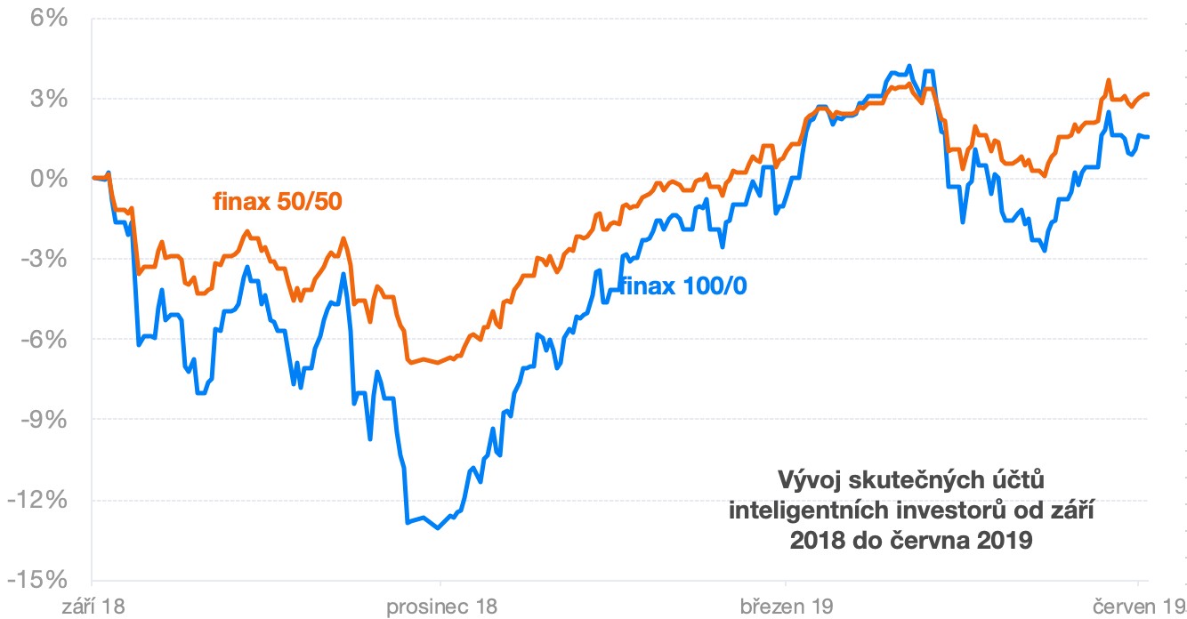 První graf ukazuje vývoj dvou vzorových modelovaných portfolií Finax, a to růstového 80% akcií a 20% dluhopisů a konzervativního 20% akcií a 80% dluhopisů, za 20 let do ledna tohoto roku. Druhý graf znázorňuje vývoj dvou skutečných účtů našich klientů s jednorázovými investicemi od konce září 2018 do konce června 2019, a to jeden se 100% akciovou strategií a druhý s 50:50.