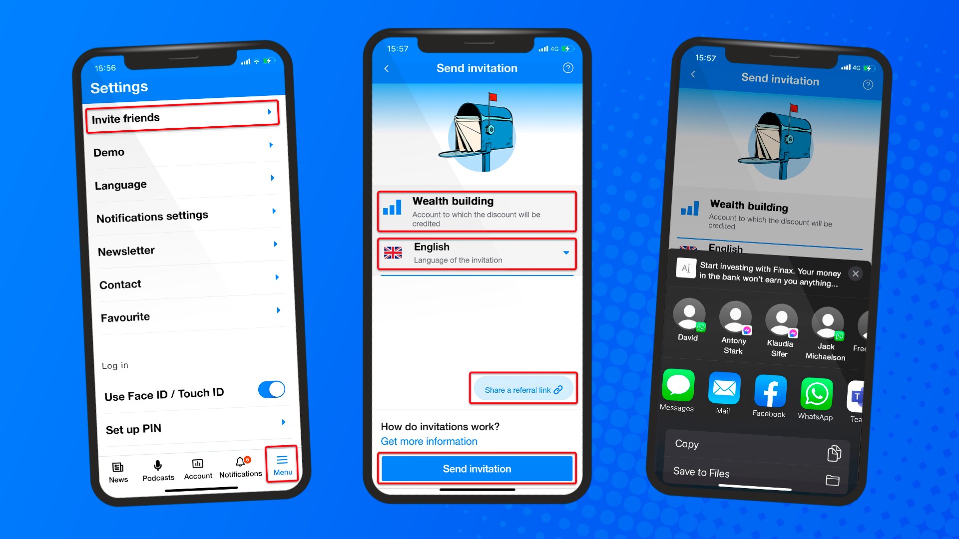 You can invite an acquaintance from the mobile app or from the online account overview on the Finax website.
