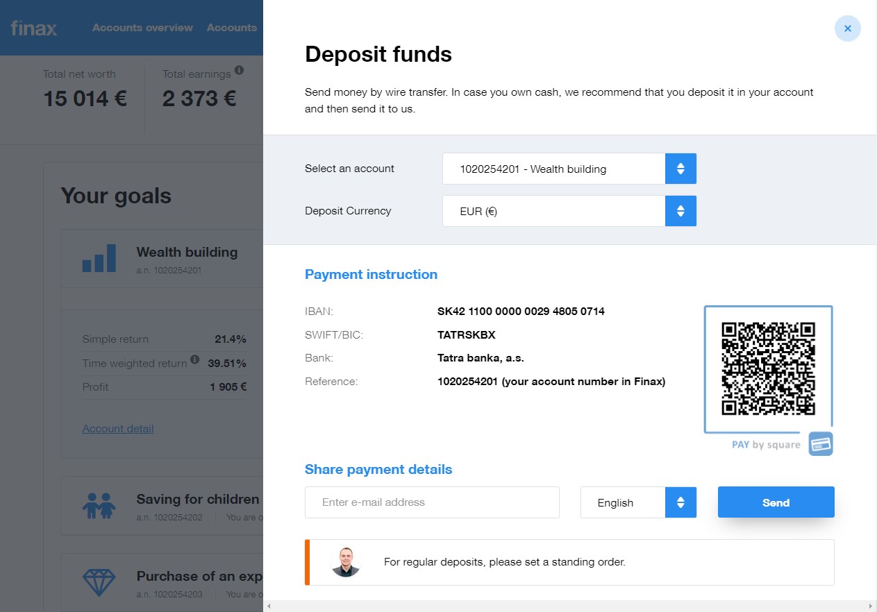 Your payment instructions can be found in the online account overview by clicking on “Deposit” in the top bar of the main menu. Make sure to firstly select the investment account to which you want to deposit your money.