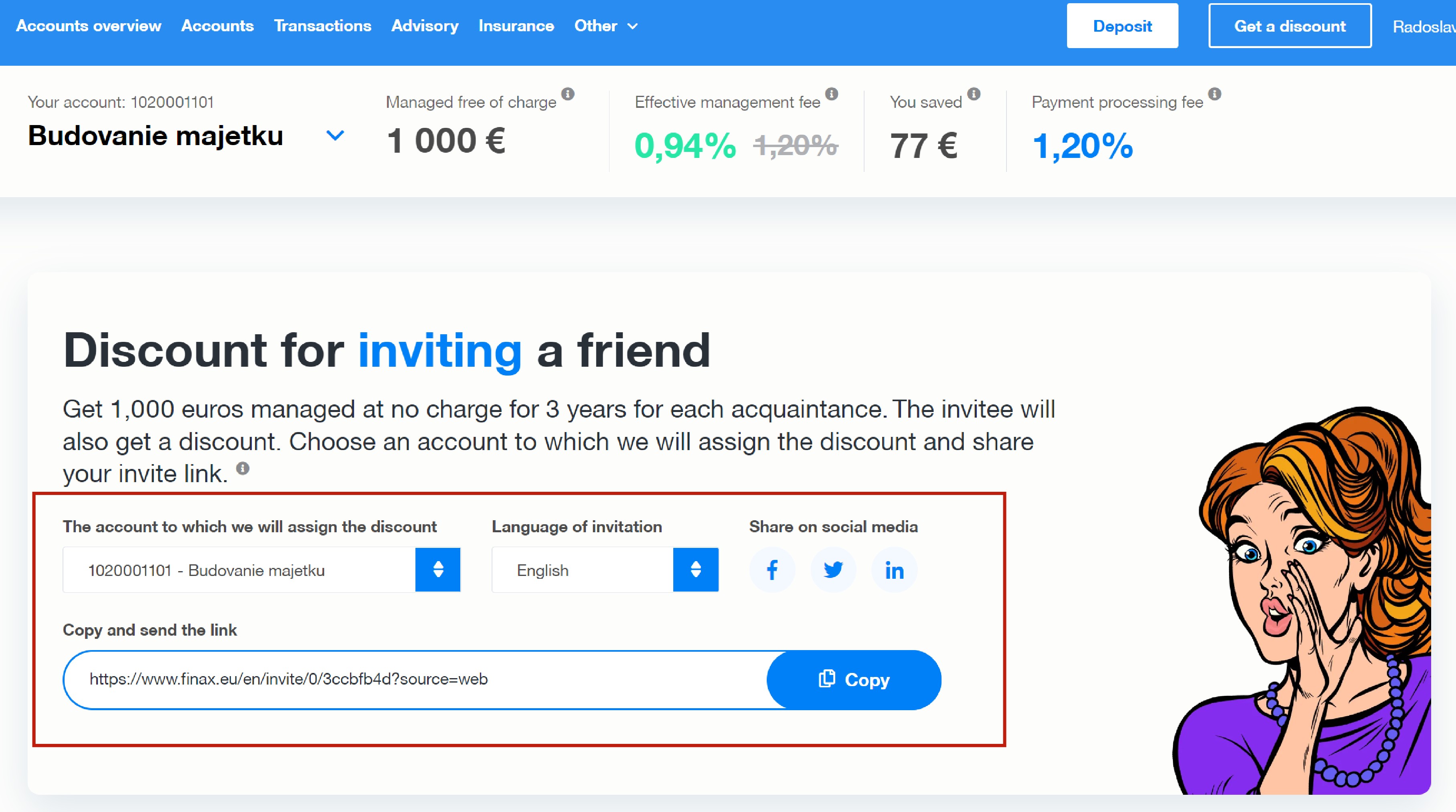 You can also invite your friends to Finax here - click on the Invite a friend button. Select the account to which you want to assign the discount once it has been activated, choose the language of the invitation, and send the invitation by the method of your choice. To get the discount, just let the friend register via this link.