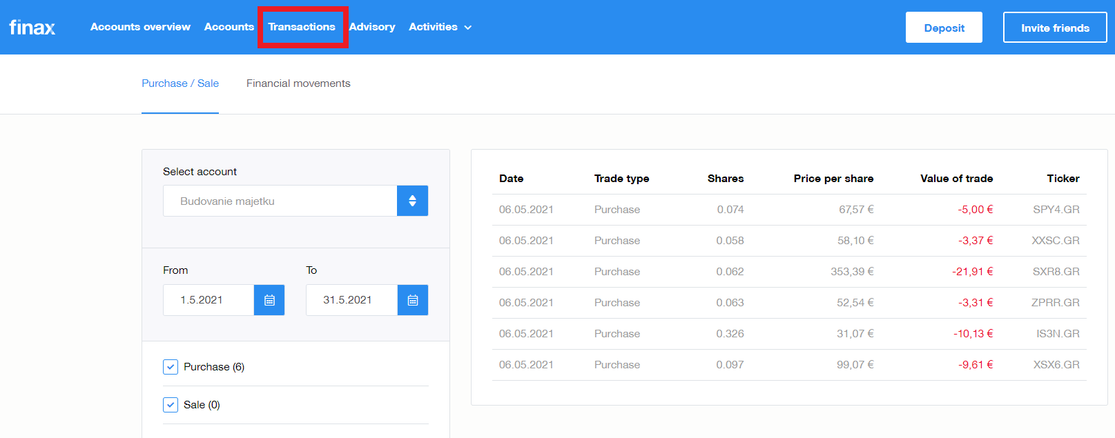 In the Transactions overview you will see the executed trades after the so-called trade settlement period, i.e., two days after the purchases are made.