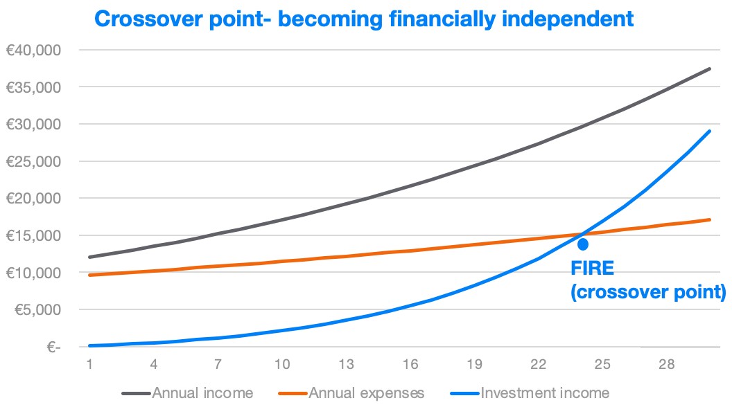 If you could, during your working life, regularly increase your annual income by 4% and your expenses would only grow at a rate of 2% per year (i.e. approximately at the level of inflation), you would become financially independent by investing regularly after about 24 years (calculating with a fairly realistic 8% annual return).