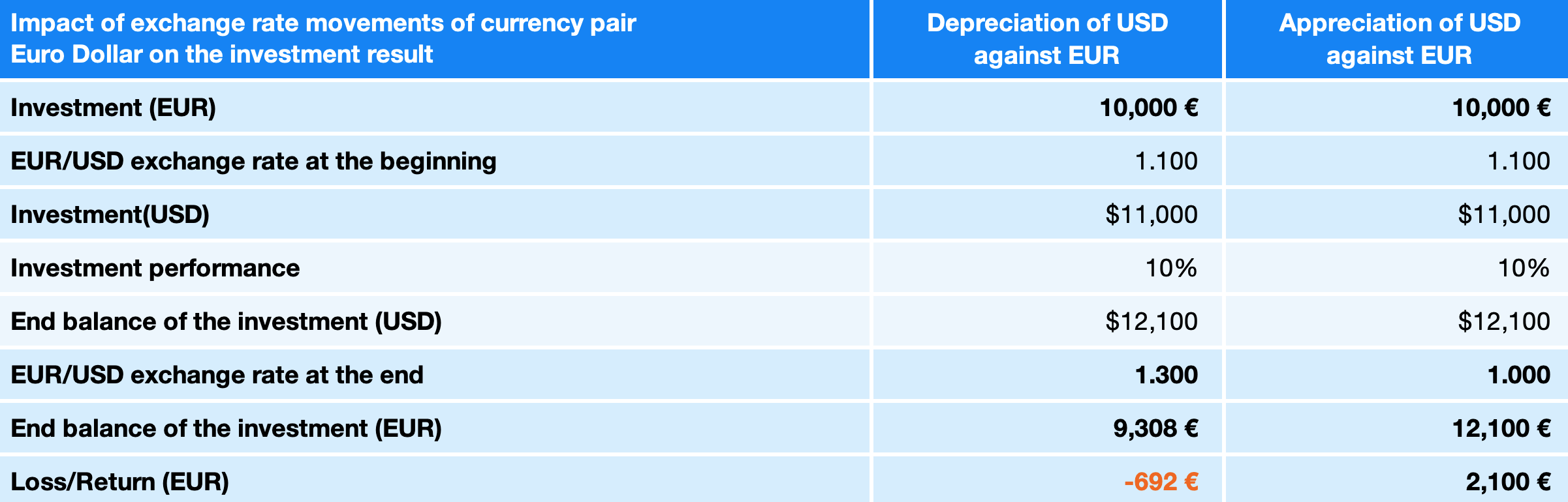 The dollar value of the ETF will increase by 10% to $ 12 100, but at the same time, the US dollar will depreciate against the euro to $ 1,3 for 1 euro. You sell the investment and convert the dollars earned back into euros. The final value of the investment will only be EUR 9 307,69, despite the positive appreciation of the fund.