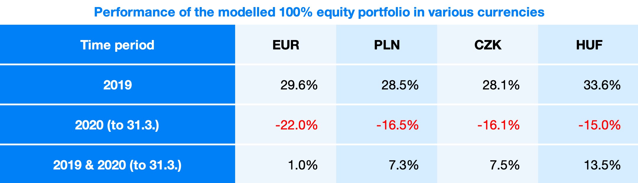Since the beginning of the year, in three months the Polish Zloty has lost 6.6% against the euro, the Czech Koruna 7.1% and the Hungarian Forint 8.2%. This depreciation of currencies is what represents the exchange rate gain for Polish, Czech and Hungarian Finax investors and a decent compensation for the decline in the value of ETFs.