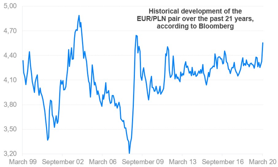 The assumption only applies to the Czech Koruna, which has appreciated against the euro by 41% in 20 years (end of March 2020). As the following chart shows, the Polish Zloty is now even weaker against the euro, roughly on the same level as it was in 2000.