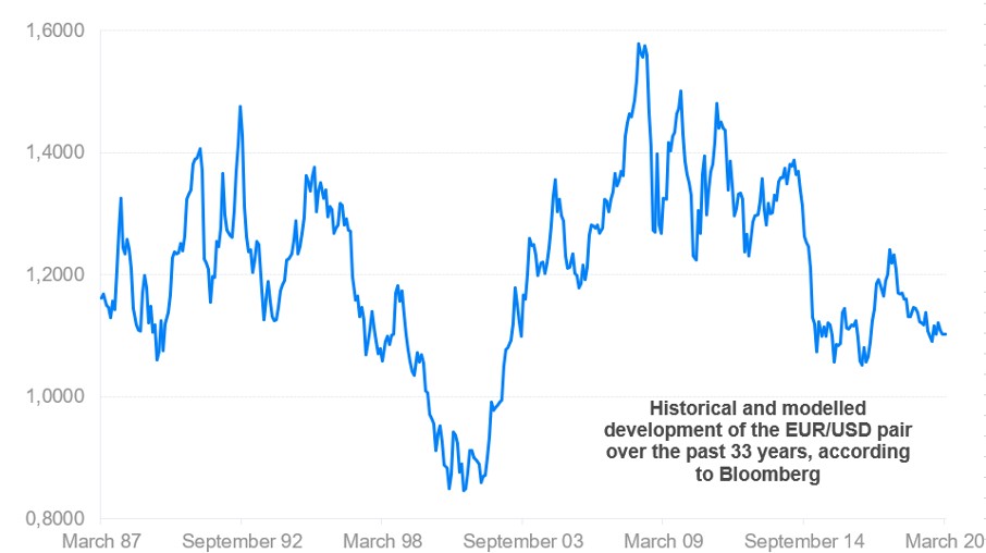 The Bloomberg news agency modelled the Euro Dollar currency pair, beginning with the end of the 1980s, based to the development of individual national currencies on the basis of which the euro was created. Historically, the world's major currency pair value has always ranged from $ 0.8 to $ 1.6 per euro. It is currently around 1.09 EUR / USD (16.4.2020).