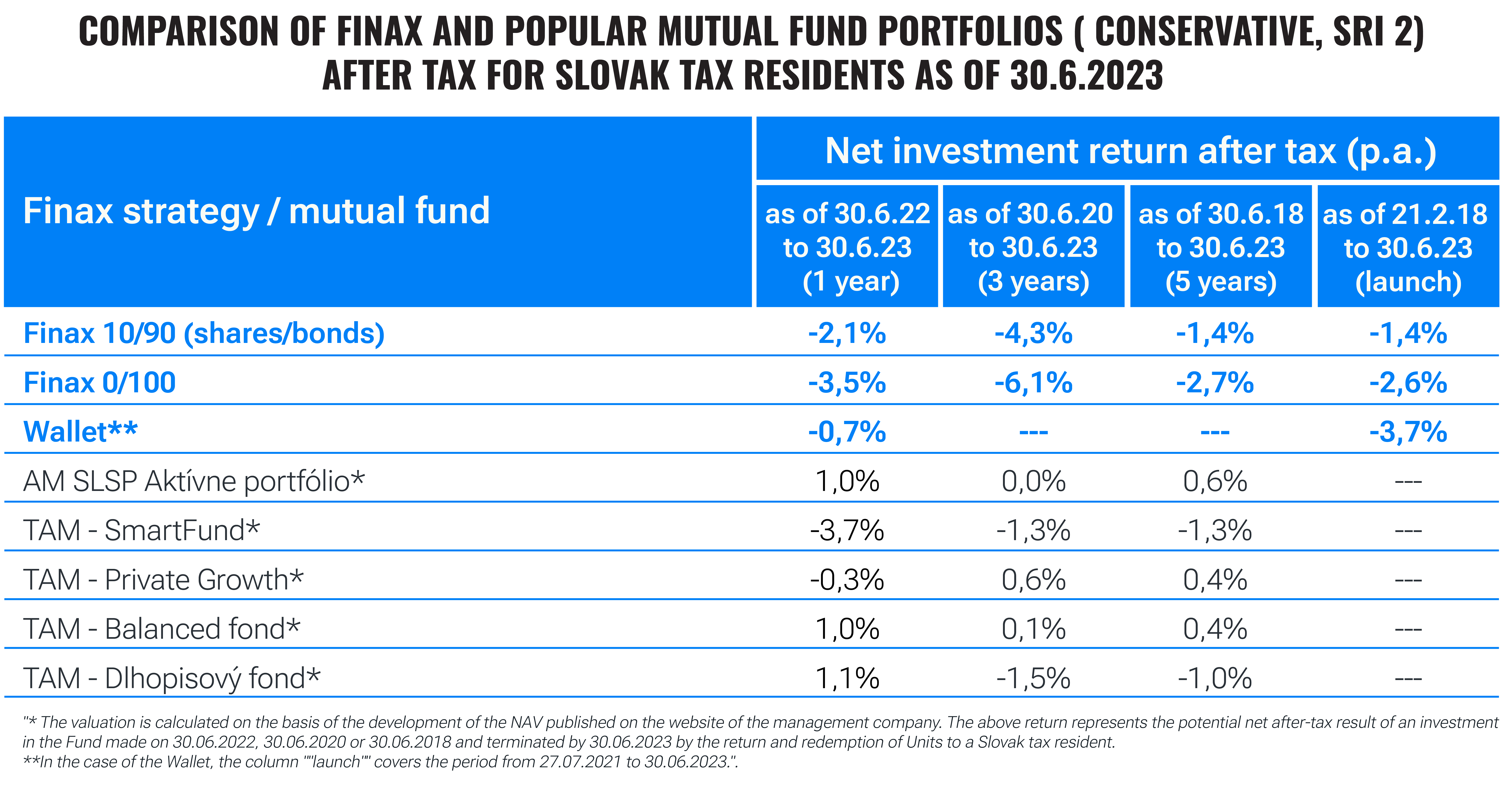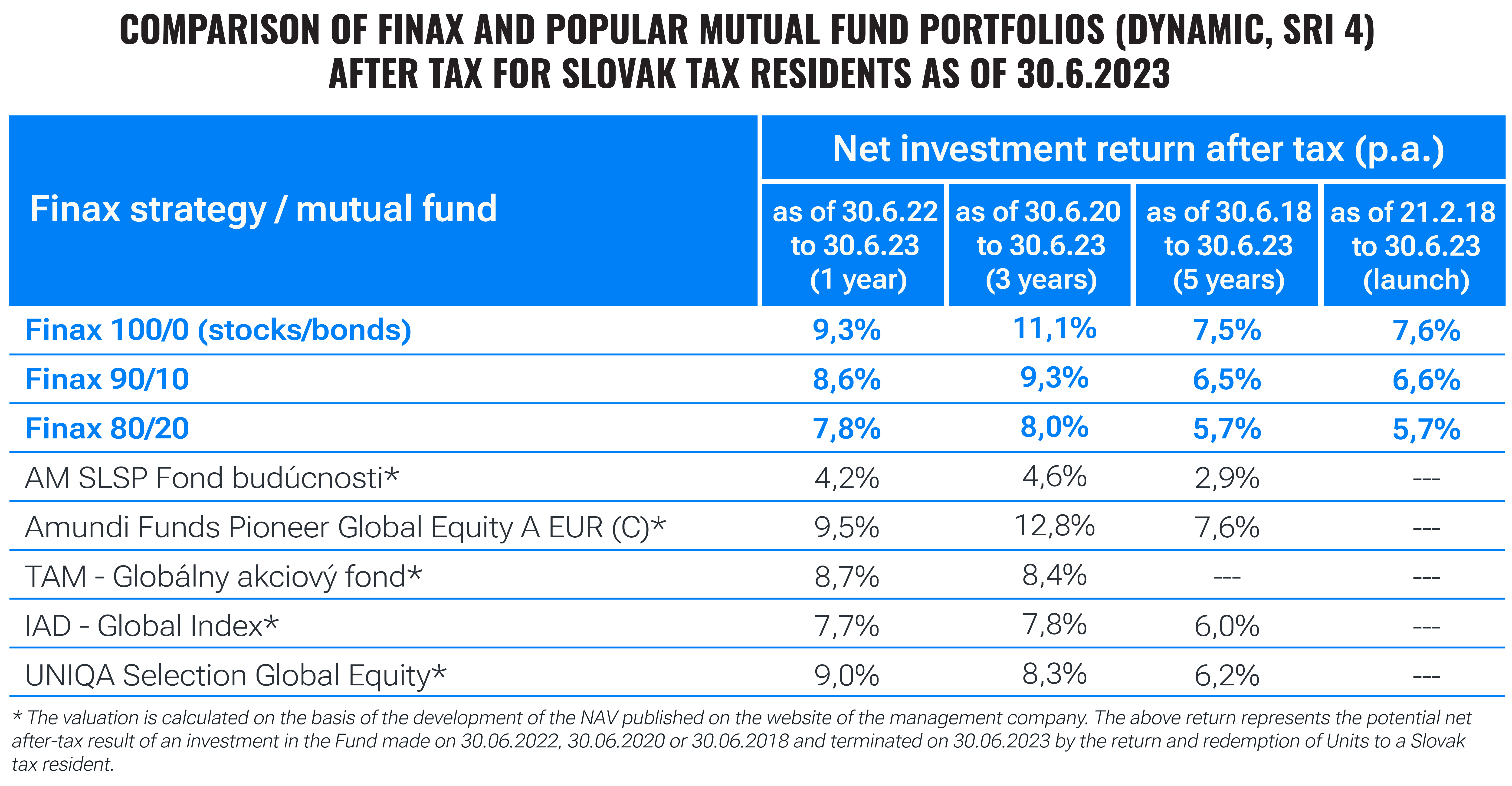 In the blog, we compared the net performance after fees and potential taxation (for Slovak tax residents holding the investment for a period of at least 1 year) of hypothetical investments in Finax portfolios and the most popular mutual funds in Slovakia terminated as of 30.06.2023.