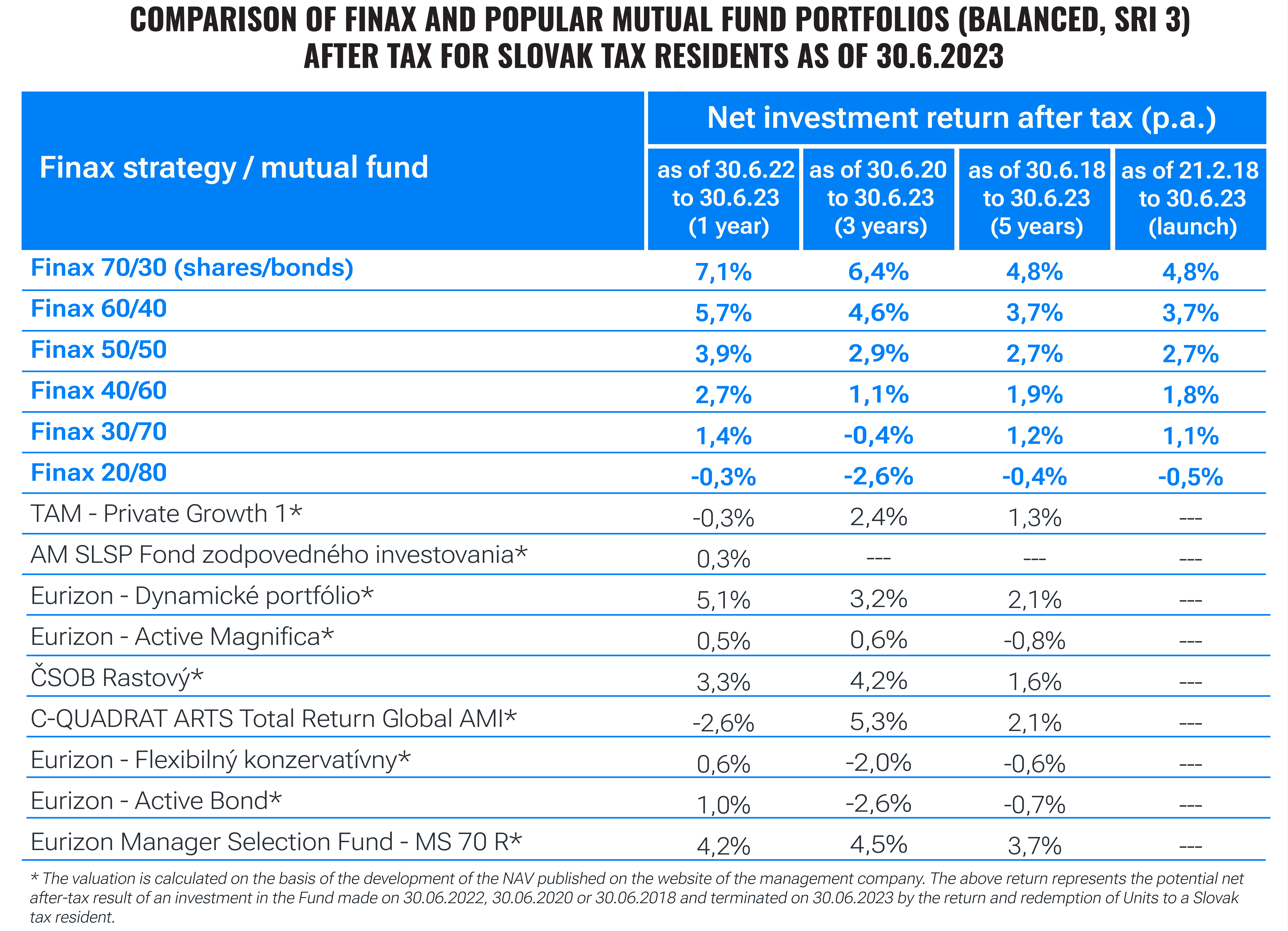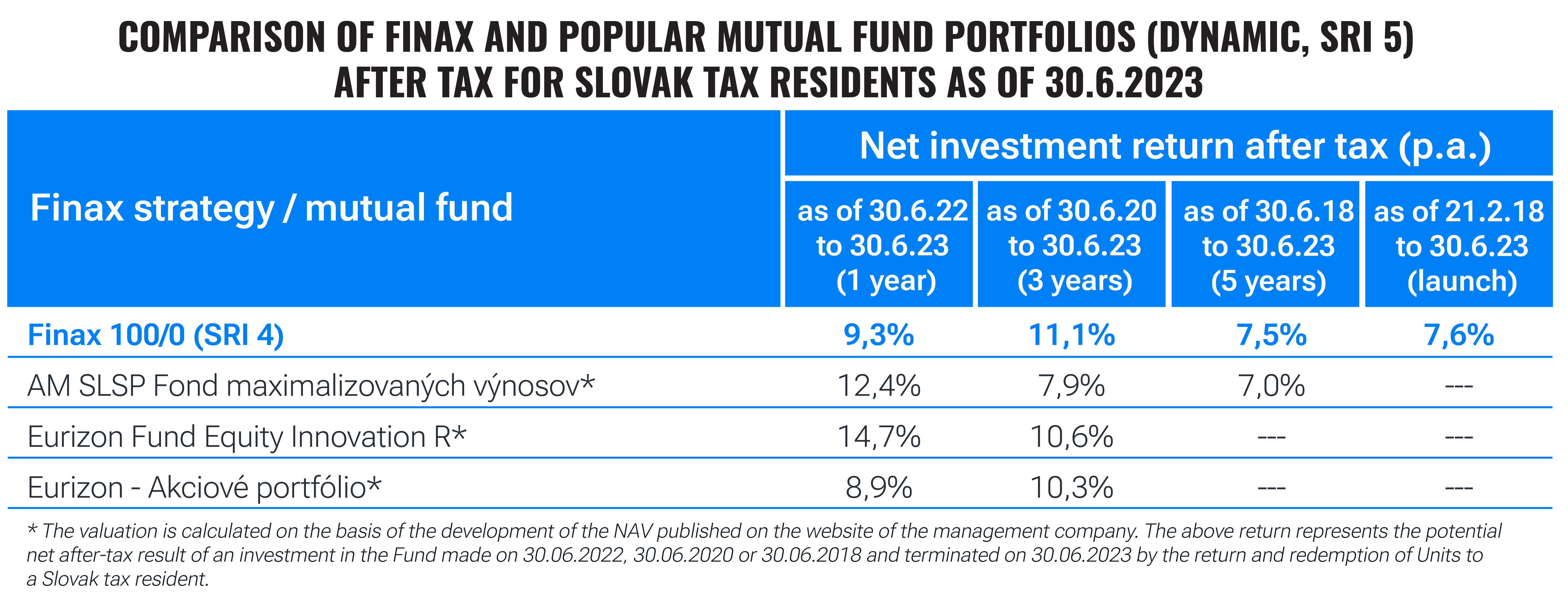 Tax Disclaimer: The tax treatment depends on each client's individual circumstances and may vary. Income from the transfer of securities (Art. 8(1)(e) of Act 595/2003 Coll. on income tax) traded on a regulated market are exempt from tax after one year from their acquisition (Section 9(1)(k) of Act 595/2003 Coll.). Income from the sale of ETFs forming the Finax portfolios meets the tax exemption conditions if they are held for at least 1 year and are not included in the taxpayer's business assets. This exemption does not apply to investors who are not Slovak tax residents. Income from redemption (redemption) of units (Art. 7(1)(g) of Act No. 595/2003 Coll.) is subject to tax. The taxation regime for Finax portfolios may change in the future. In our comparisons, we work with the net after-tax income for Slovak tax residents under the currently applicable legislation and do not take into account any rebalancing in the previous year when assessing the tax liability on the Finax portfolios. We use a 19% income tax rate to calculate the net income of mutual funds (to determine the amount of taxation of income from mutual funds).