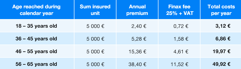The sum insured is always a multiple of the sum insured unit of EUR 5,000, up to a maximum of EUR 50 000. Then, according to the sum insured and the age reached in the calendar year in which the insurance is concluded, the price of the insurance, including the Finax fee and VAT, is determined.