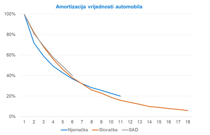 Ova tablica jasno pokazuje da na početku cijene automobila u Njemačkoj padaju znatno bržim tempom u odnosu na Slovačku. Usudim se pretpostaviti da je to zato što se u Njemačkoj kupuje (i stoga prodaje) više novih automobila po glavi stanovnika. To znači da je ponuda rabljenih automobila puno veća. S druge strane, (opet nagađam) zbog bolje njege i redovitog servisa, njihova cijena kasnije ne pada tako značajno kao što je to bio slučaj u početku.