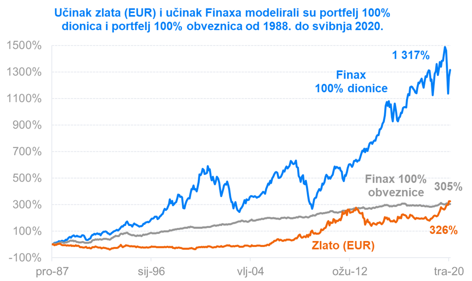 Sljedeći grafikon uspoređuje razvoj cijene zlata u eurima i modelirani razvoj dva Finax portfelja, i to najdinamičniju 100% dionice strategiju i najkonzervativniju 100% obveznice strategiju. Usporedba datira s početka 1988. godine, jer smo modelirali svoje portfelje do ovog datuma.