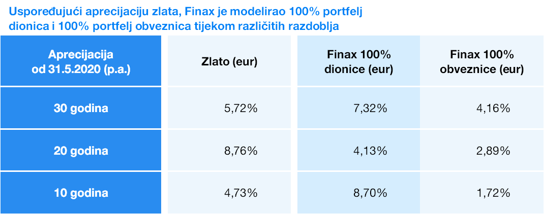 Uspoređuje prinos zlata u eurima do kraja svibnja ove godine i učinak Finaxovog modeliranog 100% dionice portfelja i modeliranog 100% obveznice portfelja, uključujući sve naknade za upravljanje portfeljem.
