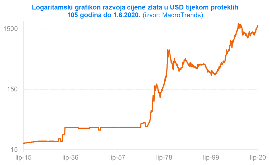 Razvoj cijena zlata je različit za svaki horizont, kao što pokazuje 105 – godišnji grafikon. Povijest pamti razdoblja kada je ulaganje u zlato ostvarivalo vrlo visoke povrate, ali i duga razdoblja u kojima je cijena zlata stagnirala ili čak opadala.