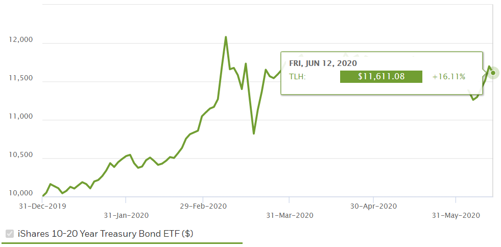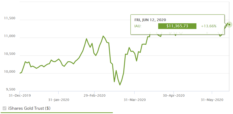 Sljedeća dva grafikona uspoređuju razvoj dvaju iShares ETF – a u američkim dolarima od početka godine do 12. lipnja 2020. U prvom grafikonu se ulaže u fizičke zlatne poluge i šipke (IAU), a u drugom grafikonu u američke državne obveznice s dospijećem od 10 do 20 godina (TLH).