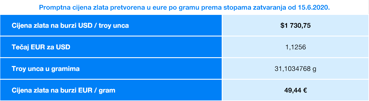 Izračunao sam to za Vas. Od 12. lipnja 2020., prema zatvarajućim cijenama zlata i tečaju eura prema dolaru, gram zlata je koštao 49.44 eura.