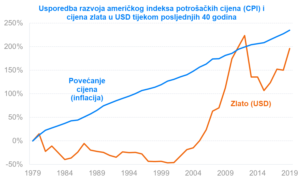 Stvarne gubitke, uzimajući u obzir inflaciju, zlato nije nadoknadilo od 1980. godine. Prošlo je nevjerojatnih 40 godina, a Vi još zapravo niste ništa zaradili od ulaganja u zlato – rast cijene zlata nije pokrio ni inflaciju. Zlato Vas, stoga, ne bi zaštitilo od rasta cijena.