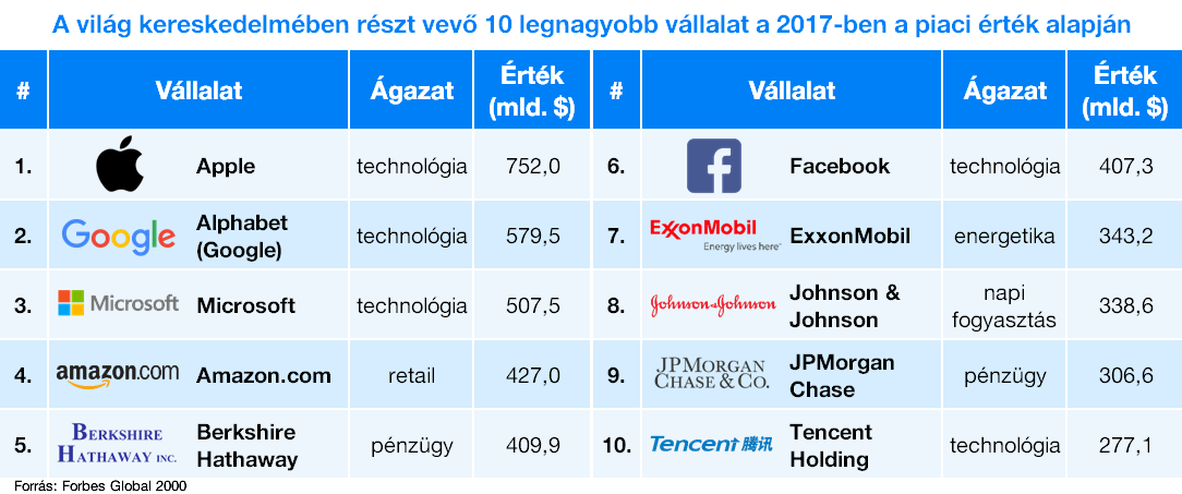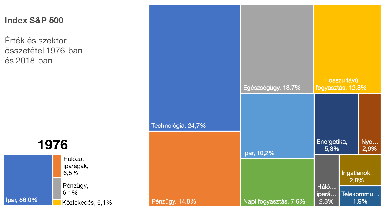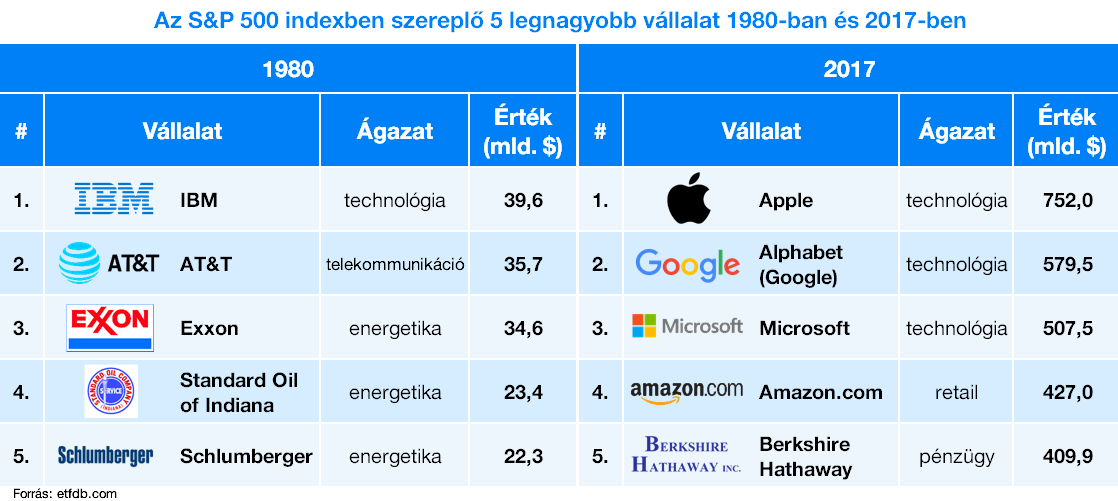 Az S&P 500 indexben szereplő 10 legnagyobb cég értéke 1980-ban összesen 236 milliárd dollár volt, ma az indexben jelen lévő legnagyobb cég, az Apple értéke 870 milliárd dollárt tesz ki.