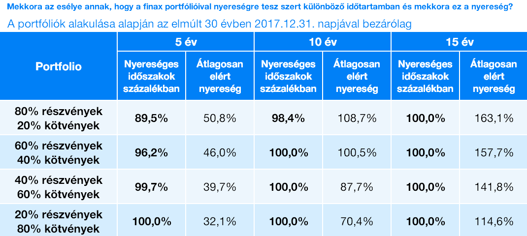 A következő táblázat azt mutatja, milyen valószínűséggel és mekkora nyereséget érhet el a Finax által kínált, euróban vezetett portfóliókkal az adott időintervallumban az elmúlt 30 év során.