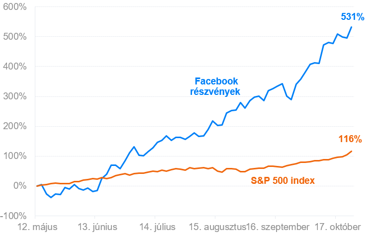 Az alábbi grafikon a Facebook részvényárfolyamainak alakulását mutatja a tőzsdére lépésétől 2012. májusában 2017 végéig, valamint az amerikai S&P 500 index értékének alakulását azonos idő alatt.