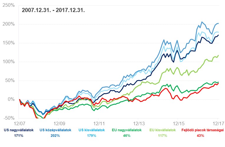 Az alábbi ábra bemutatja az intelligens befektetés által kezelt portfóliók tőkekomponensének alapját képező 6 index értékének alakulását a 2017 végéig tartó 10 év alatt. A diagram pontosan megmutatja, miért az amerikai részvények ma a legnépszerűbbek. Jelenleg ezek a legjövedelmezőbbek.