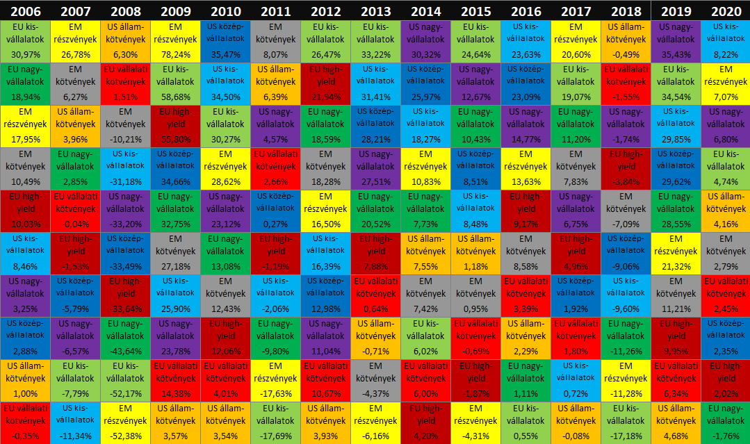 A diverzifikáció jelentőségét tökéletesen szemlélteti az általunk kedvelt ún. hozamperiodikus rendszer, amelyet a Callan társaság hozott be a köztudatba. Az első pillantásra bonyolult rendszer könnyen értelmezhető képet nyújt az eszközosztályok alakulásáról az egyes években.