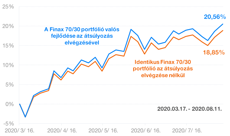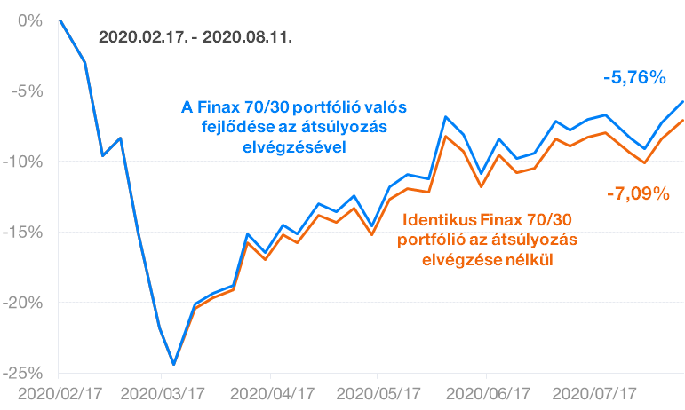 A két portfólió fejlődését a következő ábra mutatja. A kék görbe a Finax ügyfél portfóliója valós fejlődését mutatja a narancssárga pedig egy ugyanolyan portfóliót a 2020.3.17.-i átsúlyozás elvégzése nélkül.
