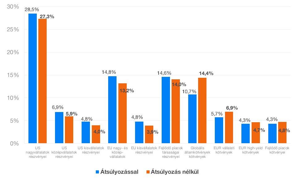 Átsúlyozással természetesen a legveszteségesebb aktívumok vétele történik, azaz azoké, amelyek az előző táblázat szerint a legnagyobb veszteséget mutatták. Így a jelenlegi súlyozás relatív különbsége az optimálissal szemben a legnagyobb (a narancssárga és a kék oszlop közötti különbség). Konkrétan az európai és amerikai kisvállalatok részvényeiről, valamint az amerikai közepes nagyságú vállalatok részvényeiről volt szó.