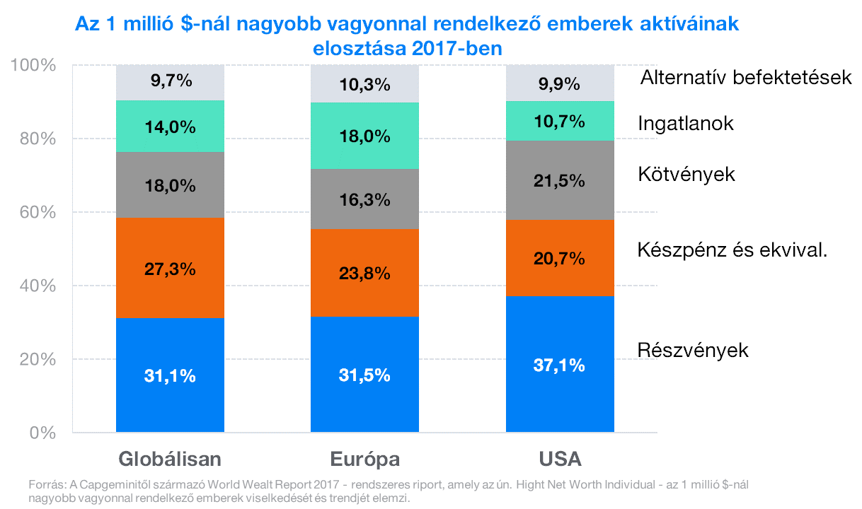 A következő két grafikon bemutatja a gazdag emberek aktíváinak struktúráját és egyes aktívák hozzájárulását a vagyon növekedését tekintve 2017-ben a Capgeminitől származó rendszeres World Wealth Report jelentése alapján. A portfóliókban a részvények dominálnak - a vagyon csaknem egyharmadát képezik.