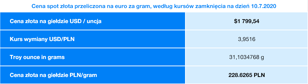 Uncja trojańska wynosi 31,1034768 gramów. Oprócz jednostki masy należy uwzględnić w obliczeniach kurs dolara amerykańskiego w stosunku do euro.