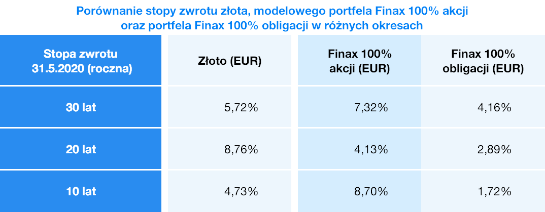 Rozwój doskonale ilustruje twierdzenie o niższym zysku ze złota w porównaniu do innych klas aktywów. Podczas, gdy cena metalu szlachetnego wzrosła o 326% w ciągu prawie 32,5 roku, akcje przyniosły ponad czterokrotnie wyższe zyski. Wszystkie modelowane dane Finax uwzględniają pełne opłaty za zarządzanie portfelem (1,2% rocznie).