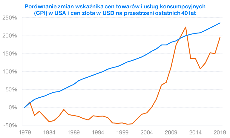 Rzeczywiste straty uwzględniające inflację, nie zostały przez złoto odrobione od 1980 roku. Upłynęło niewiarygodne 40 lat, a tak naprawdę inwestor niczego nie zarobił na swojej inwestycji w złoto - wzrost ceny złota nie pokrył nawet inflacji. Złoto tak naprawdę nie ochroniłoby Cię przed rosnącymi cenami.
