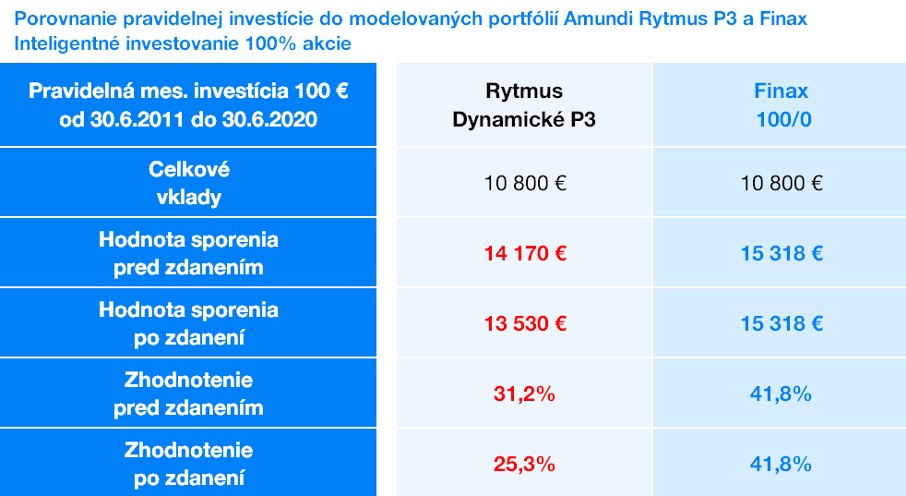 Rozdiel v čistom zhodnotení investície v Dynamickom P3 Rytmus portfóliu a modelovanom 100% akciovom portfóliu Finax je za uplynulých 9 rokov skoro dvojnásobný. Kým Finax by za 9 rokov pri investícii 10 tis. eur dosiahol čistý výnos 11 600 eur, akciový Rytmus by priniesol len necelých 4 460 eur.