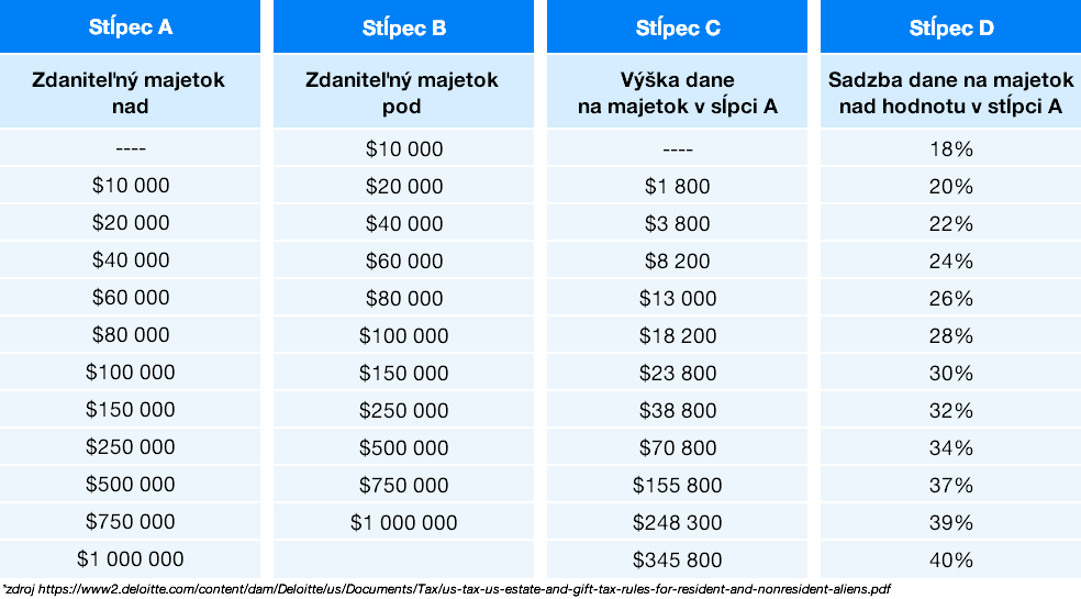 Daň z dedičstva (Estate tax) sa vzťahuje na majetok každého, kto v čase smrti vlastní nejaké americké aktíva, či už nehnuteľnosť na Floride alebo akcie Applu. Pre občanov USA je hranica, od ktorej musia platiť daň až pri niekoľkých miliónoch, pre takzvaných non-resident aliens je už pri 60 tisíc dolároch.