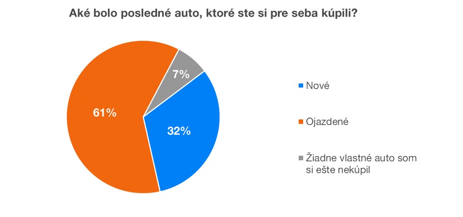 Veľmi pozitívne ma prekvapilo, že viac ako 60% respondentov (vo väčšine Finax klientov) si naposledy kúpilo ojazdené auto. Z tých, čo auto majú, sú to dokonca až dve tretiny. Ako som spomínal, väčšina respondentov sú naši klienti.