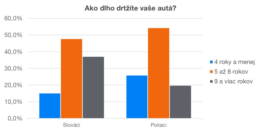 Z odpovedí podľa krajín je tiež vidieť zásadnejší rozdiel, ktorý je však spôsobený hlavne tým, že poľskí respondenti kupovali viac ojazdených áut a držia ich teda kratšie.