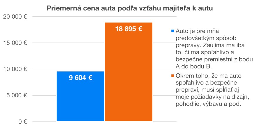 Ešte zaujímavejšie vychádza štatistika priemernej ceny pre ľudí podľa ich vzťahu k autu. Tí, pre ktorých je dôležité, aby ho auto premiestnilo z bodu A do bodu B, zaplatia v priemere za auto 9 604 eur. Naopak, pre koho je dôležitý dizajn, pohodlie a výbava zaplatil v priemere 18 895 eur, čo je takmer dvojnásobok. Váš vzťah k autu tak výrazne ovplyvní cenu auta.