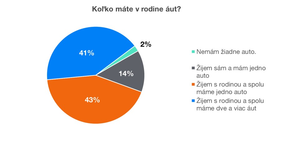Dve autá v rodine má až polovica domácností (41% vs. 43%). Aj to svedčí o vysokom štandarde našich respondentov. Ak prirátam aj tých, čo majú vlastné auto a žijú sami, 55% má auto samo pre seba. Tu vidím obrovský priestor na podnikateľský zámer najbližšieho desaťročia. Zdieľané autá. Tak, ako som ich mal možnosť zažiť v Berlíne, majú podľa mňa pred sebou veľkú budúcnosť.