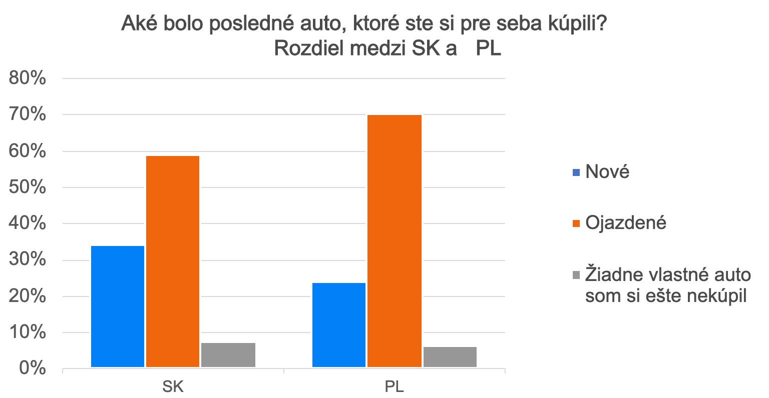 Mierny rozdiel je aj medzi slovenskými a poľskými respondentmi, kde u Poliakov prevažujú viac ojazdené/žiadne autá na úkor nových áut. Je to však dané aj demografickým profilom našich poľských zákazníkov.