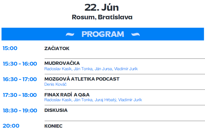Príďte s nami stráviť štvrtkové poobedie! Na terase budovy Rosum sa na Vás teší vedenie Finaxu, ktoré pre Vás zamudruje naživo, zodpovie vaše otázky a spoločne s Denisom Kováčom (Mozgová Atletika) a Vladom Juríkom (Peniaze sú čas) podebatuje na zaujímavé finančné témy.