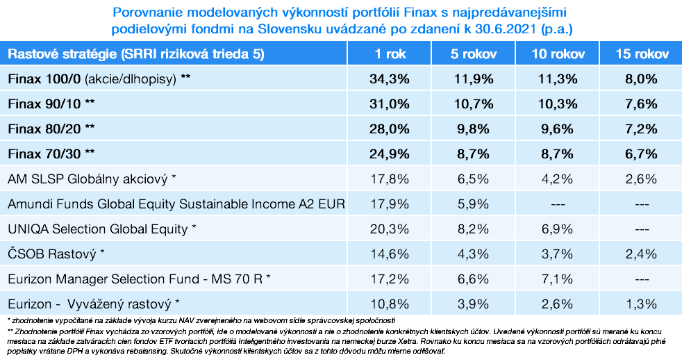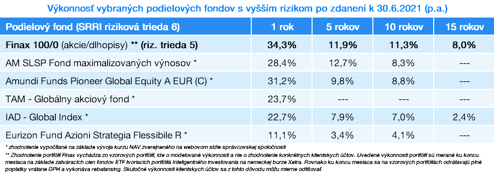 Štyri najdynamickejšie portfóliá Finaxu so zastúpením akcií v pomere 70% až 100% podľa metodiky SRRI patria k 30.6.2021 do rizikovej triedy 5.