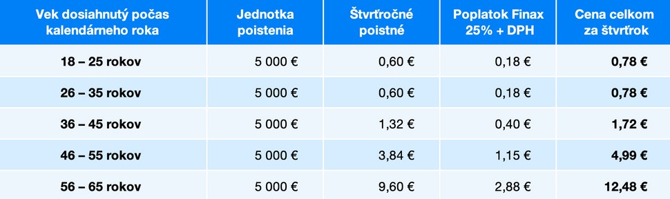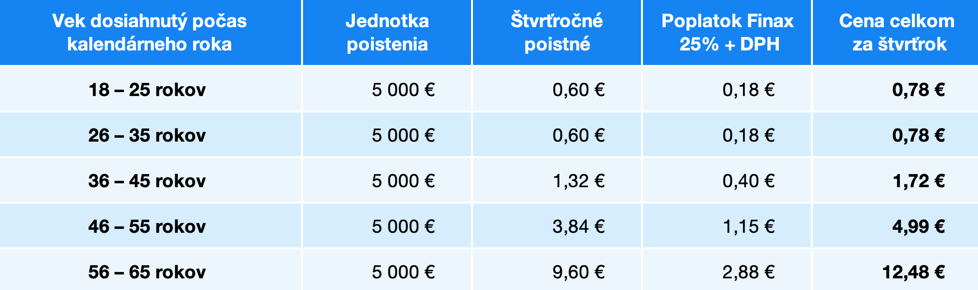 Poistná suma je vždy násobkom jednotky poistenia 5 000 eur, maximálne 50 000 eur. Následne je podľa poistnej sumy a dosiahnutého veku v kalendárnom roku, v ktorom poistenie uzatvárate, stanovená cena poistenia vrátane poplatku Finaxu a DPH z neho.